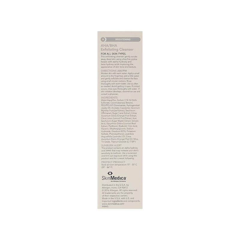 SkinMedica’s AHA/BHA Exfoliating Cleanser, a facial cleanser that gently scrubs away dead skin, improving the appearance of skin tone and texture. It comes in a 6 fl. oz. bottle and is good for all skin types.